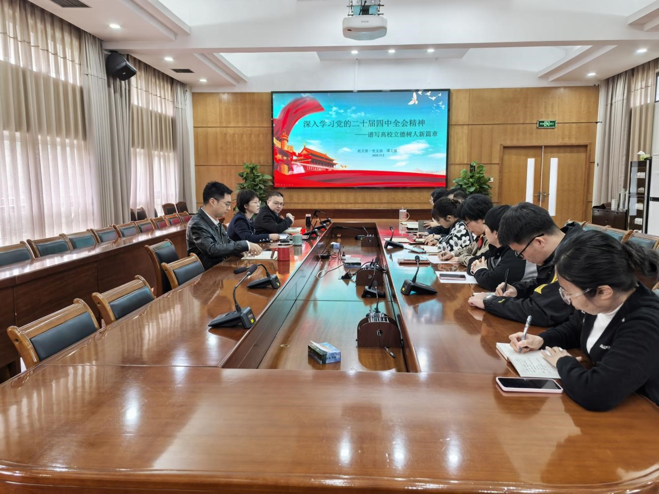 为深入学习贯彻党的二十届四中全会精神,切实把思想和行动统一到党中央决策部署上来,11月5日上午,机关第一党支部书记谭天敏以“深入学习党的二十届四中全会精神,谱写高校立德树人新篇章”为题,面向支部全体党员讲党课。
